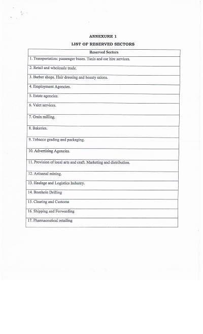 فهرست موارد غیرقابل سرمایه گذاری توسط اتباع بیگانه در زیمبابوه